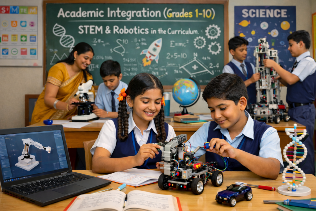 Academic Integration (Grades 1-10) Empowering the next generation through seamless STEM and Robotics integration into the core academic curriculum. Primary (Grades 1-5) Focus on logical thinking, basic mechanics, and introduction to visual programming through play-based learning. Middle (Grades 6-8) Advanced robotics concepts, electronics, and block-based coding to solve real-world mathematical and scientific problems. Secondary (Grades 9-10) Complex automation, AI basics, and text-based programming (Python/C++) aligned with board examination standards.